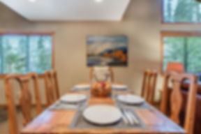 After you come up the stairs on the outside of the building, you will enter onto the main level with its spacious great room with plentiful windows, vaulted wood beam ceilings and wonderful views to Lincoln Mountain and the slopes at Canyon Lodge. There's a cozy wood-burning fireplace and entertainment center with a flat screen HDTV, HD digital cable TV. There's also a desk to set up your laptop so you can stay connected with the complimentary WiFi. The caramel colored leather sofas, global inspired wool rug and charcoal and cream accent pillows, and rustic pine furnishings are relaxing and inviting and great for watching the gondola go by through views of the trees. And there is original and vintage ski art.